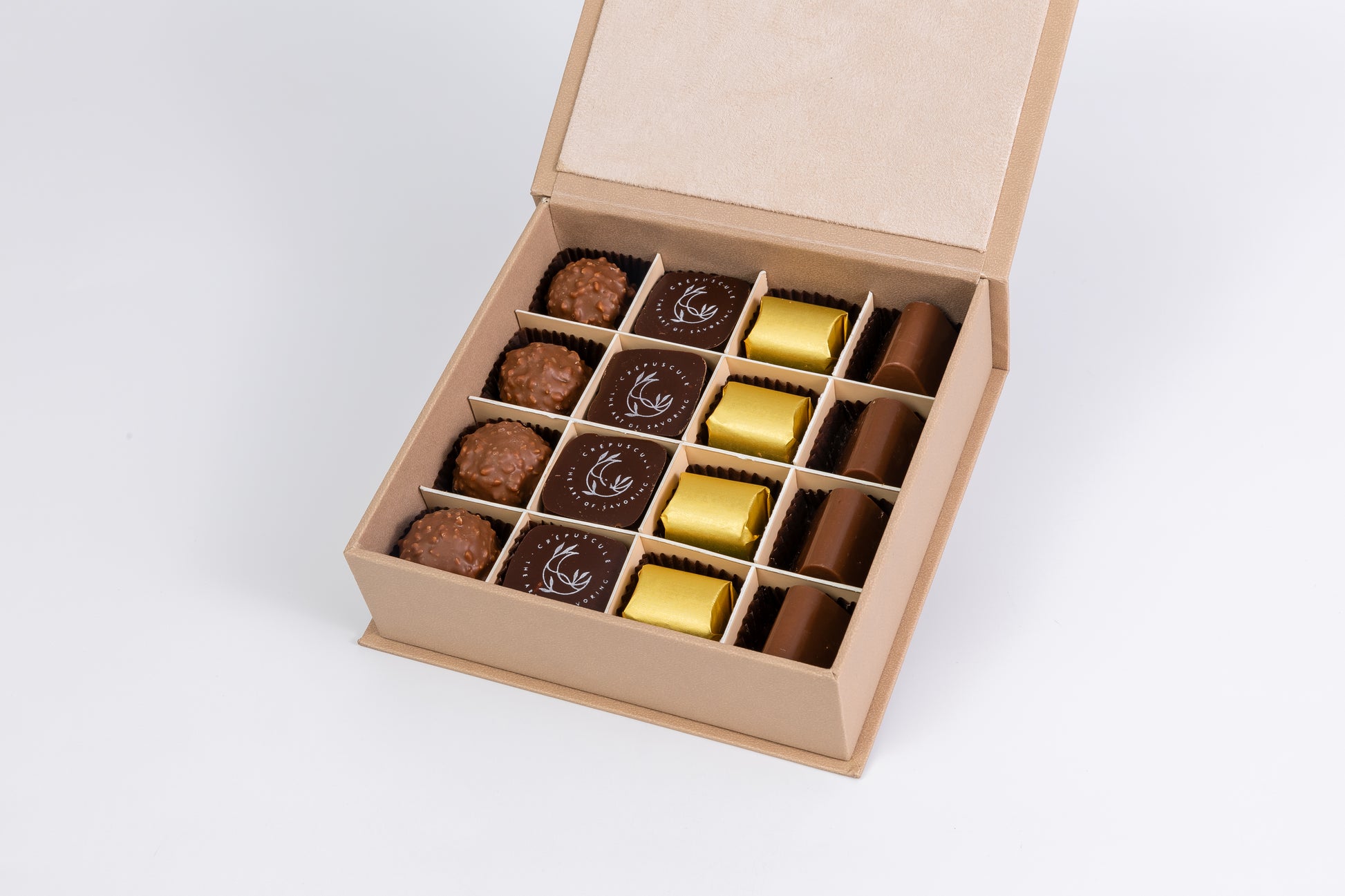 Elle réunit 16 chocolats artisanaux aux textures soyeuses et aux saveurs généreuses : praliné café, caramel fondant, noisette douce…