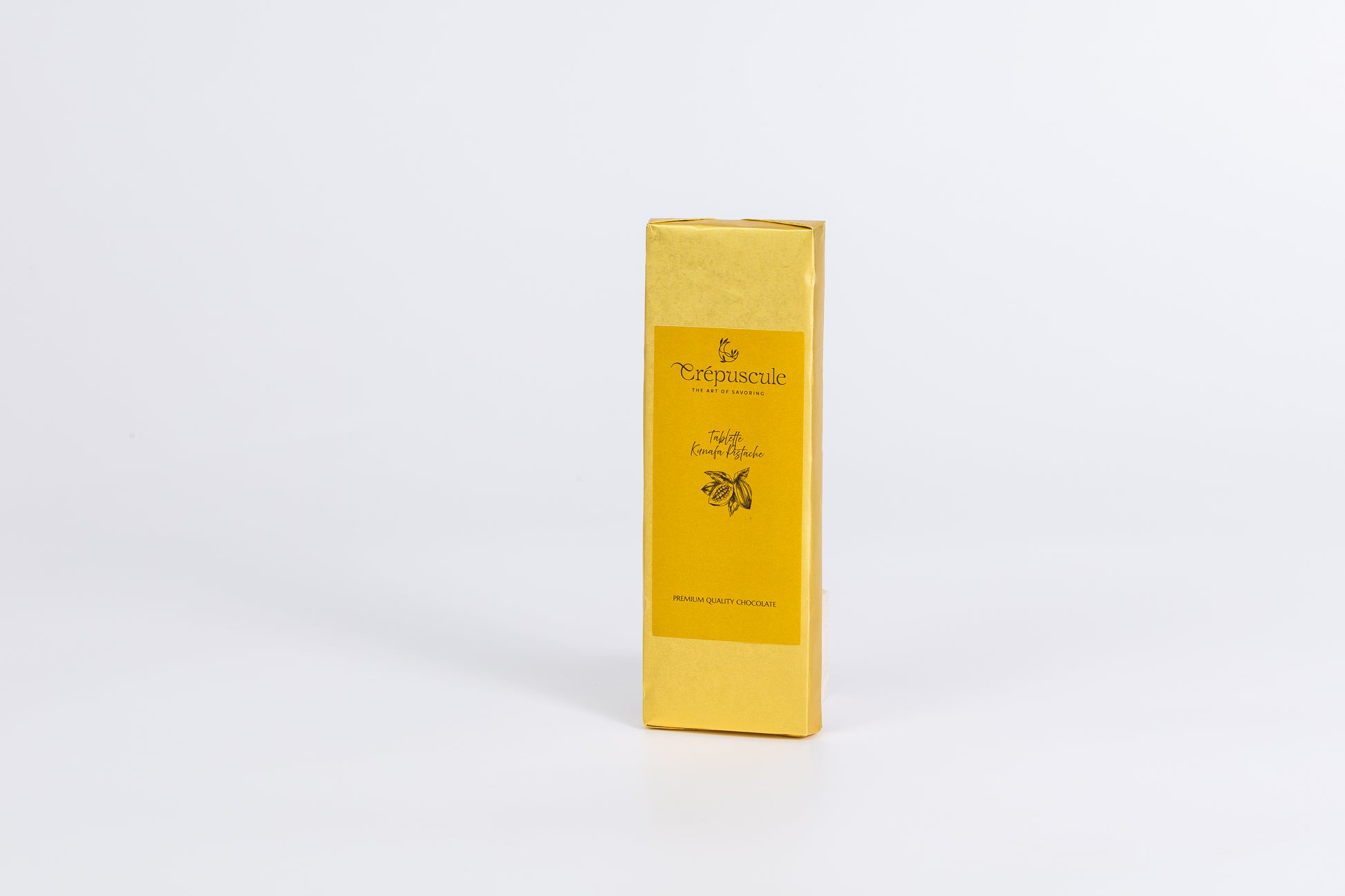La tablette Kunafa Pistache est la signature de notre collection L’Heure Dorée. Elle marie un praliné pistache onctueux à des éclats croustillants de kunafa caramélisée, le tout enveloppé dans un chocolat au lait fondant.